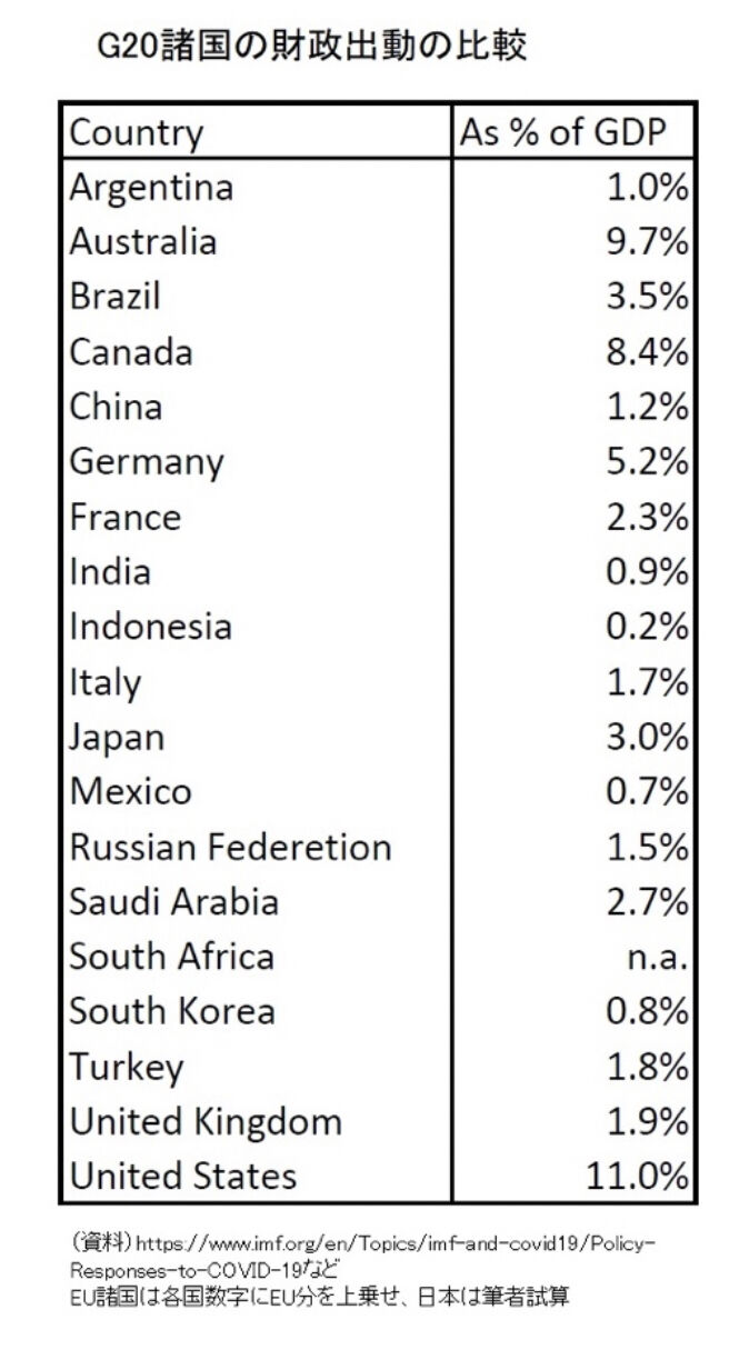 各国ともに、国内の発表では真水に含まれていないものも計上されているので、この国際比較は暫定的なものであることに注意されたい。そのうえで言えば、日本はアメリカ、オーストラリア、カナダ、ドイツに次ぐくらいの位置だ。