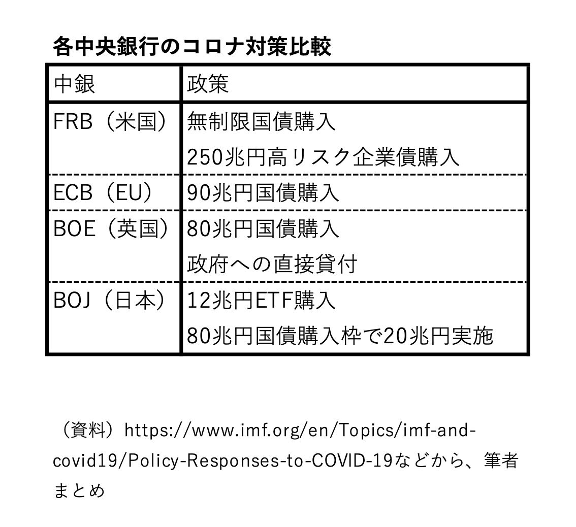 こうした緊急事態の対策では、財政政策とともに金融政策も重要である。特に、金融政策はmoney-printing によって、財政上の問題を事実上なくせる。このため、どの国でも大規模な量的緩和、つまり事実上の国債引受・買取が行われる。こうした財政政策を比較したのが以下の表だ。