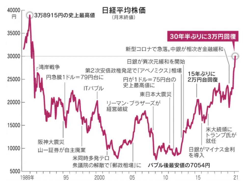 最高は、1989年12月28日の日経平均最高値は38,915円ですが、