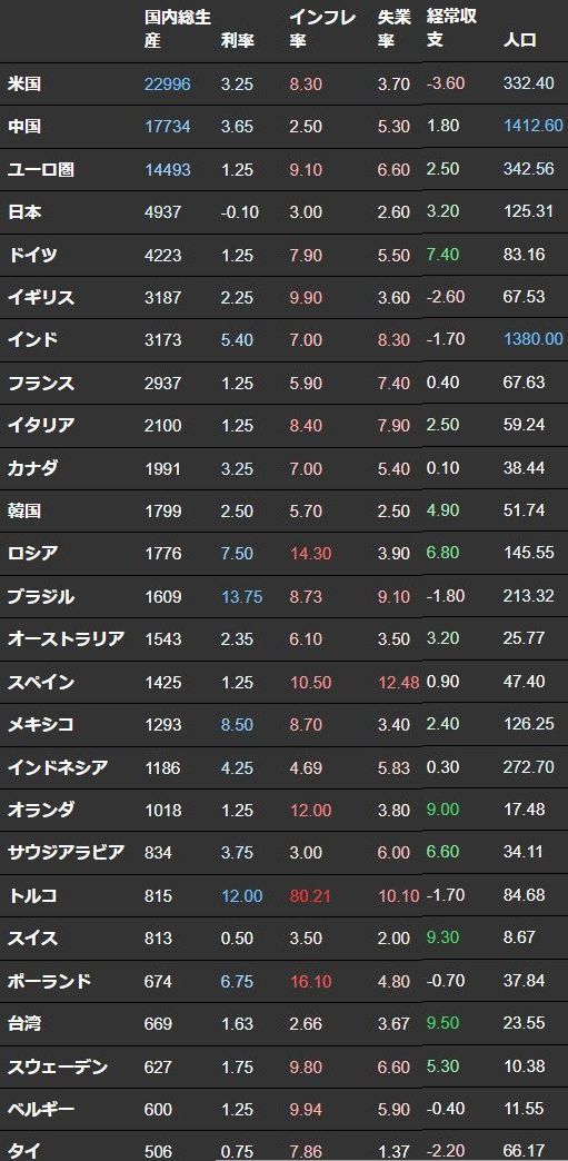 参考までに主要国のGDP、金利、インフレ率、失業率などです。
