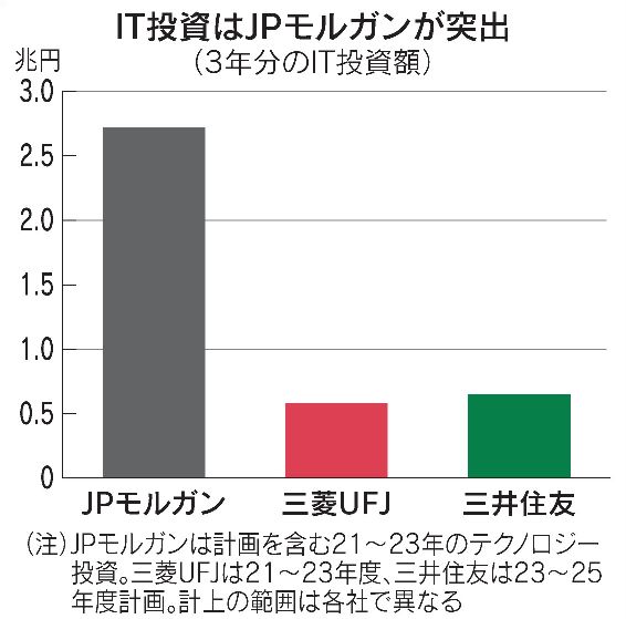 JPモルガンが23年にテクノロジー投資で72億ドル(1兆円)を投資するのに対して、日本のメガバンクの中経では3年間で6000億円前後です。